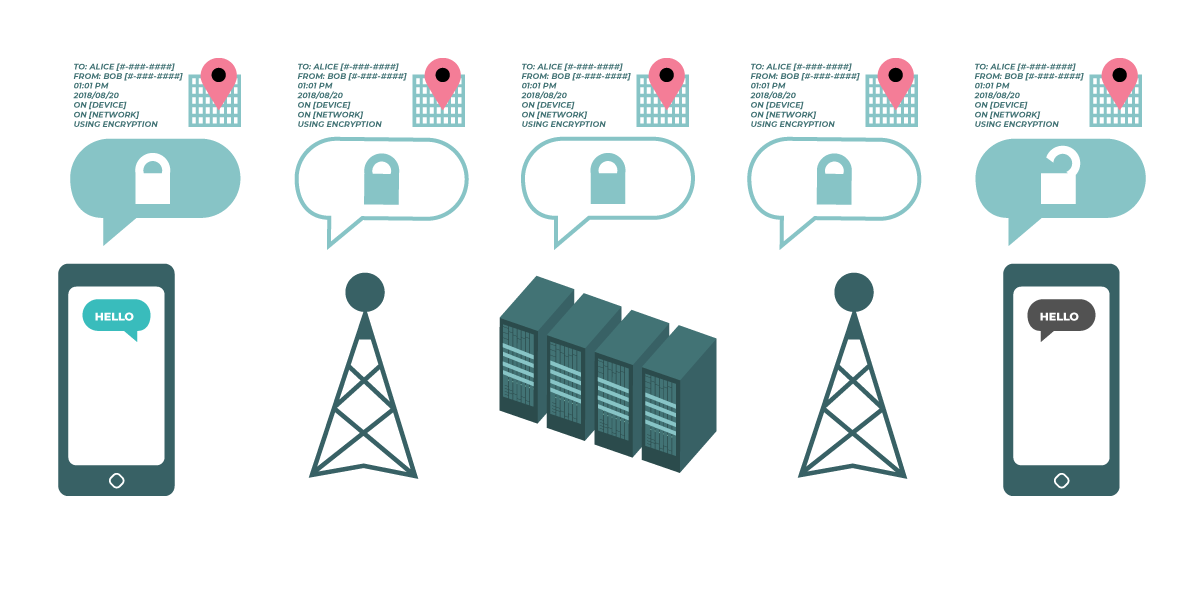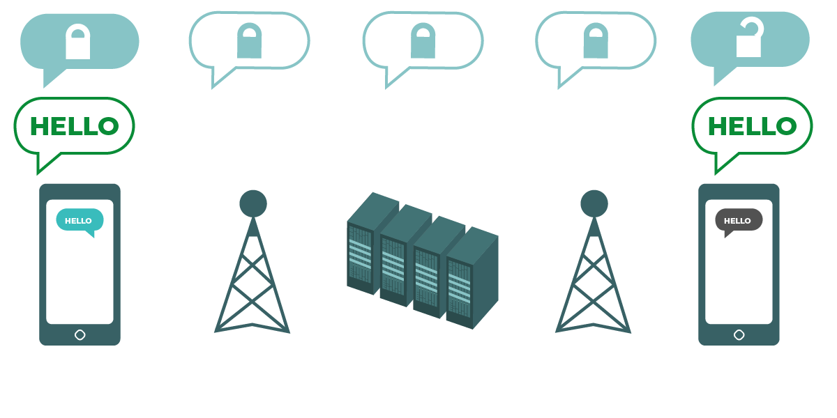 | แผนภาพแสดงการเข้ารหัสจากต้นทางถึงปลายทาง สมาร์ทโฟนทางด้านซ้ายส่งข้อความ “Hello” สีเขียวที่ไม่ได้มีการเข้ารหัส ข้อความดังกล่าวจะถูกเข้ารหัส จากนั้นจะถูกส่งต่อไปยังหอสัญญาณโทรศัพท์มือถือ และต่อไปยังเซิร์ฟเวอร์ของบริษัท ท้ายสุดสมาร์ทโฟนอีกเครื่องจะได้รับข้อความที่มีการเข้ารหัส แล้วถอดรหัสข้อความดังกล่าวเพื่อให้อ่านข้อความได้ว่า “Hello” การเข้ารหัสประเภทนี้ไม่เหมือนกับการเข้ารหัสในชั้นการขนส่ง โดยเซิร์ฟเวอร์ของ ISP ที่คุณใช้งานจะไม่สามารถถอดรหัสของข้อความได้ เฉพาะผู้รับปลายทางเท่านั้น (อุปกรณ์ต้นทางจะส่งและรับข้อความที่เข้ารหัส) ที่มีคีย์สำหรับปลดล็อกข้อความ |